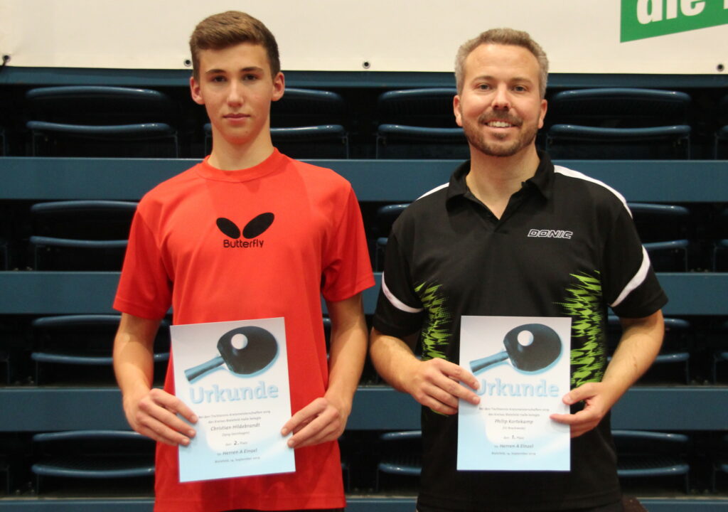 Bei den Herren A holt Phillip Kortekamp alle 3 Titel in Einzel, Doppel (mit Kai Lukas Bönsch/TSVE)
