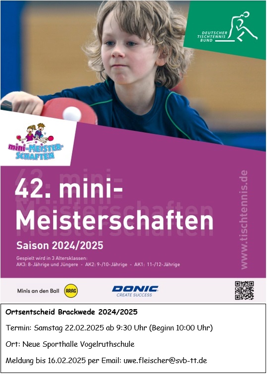 Die Mini-Meisterschaften in Brackwede stehen vor der Tür: Am Samstag, den 22. Februar 2025 um 09:30 Uhr fällt der Startschuss. Die neue Turnhalle der Vogelruthschule ist bereits ab 9:30 Uhr geöffnet, sodass vorab eine halbe Stunde Zeit zum Ankommen, anmelden, einspielen und warm werden bleibt.